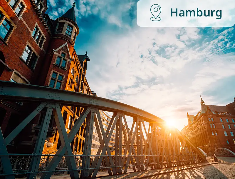 Backsteingebäude und Metallbrücke in Hamburg bei tief stehender Sonne.